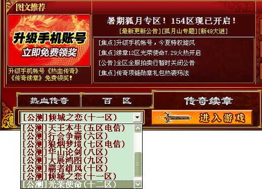 请玩家下载完整客户端,安装完成后选择“传奇续章”页签下相应的区服。如下图: