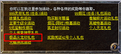 1、活动期间,玩家前往盟重活动大使处,只需10元宝,即可选择开启一次“极品火龙印礼包”。