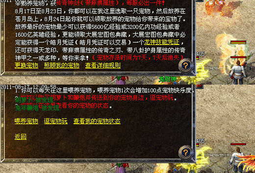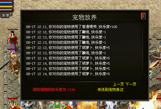 来到位于苍月岛的放养区,我和我的小宠物嬉戏起来,胡萝卜每次增加宠物快乐度5点,但鞭炮会让宠物的快乐度下降一点,可是每次都会获得不同的奖励,有经验、卷轴碎片以及灵符,不大会功夫就累积了一千多张灵符,这可把我乐坏了!