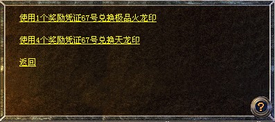每个奖励凭证67号可兑换极品火龙印一枚!4个奖励凭证更可兑换天龙印一枚!