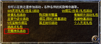 3、玩家使用2000元宝可获得1000亿经验或250亿内功经验或360亿英雄经验(英雄等级达到200不受限制),参加活动之日起(连续二十天内),玩家每天还可领取6个烟花(任务)。