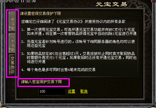 接受交易协议,玩家还可自主设置密宝保护交易下限,一旦发生超过限额的交易,就将自动弹出密宝输入框,保障玩家交易行为的自主与安全。