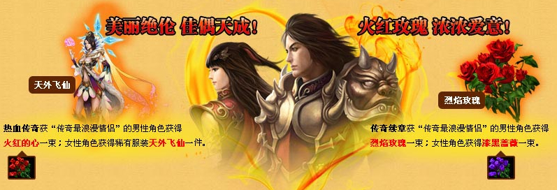热血传奇获“传奇最浪漫情侣”男性玩家获得火红的心一束;女性玩家获得天外飞仙一件。