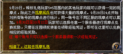 备注:只有9月28日当天释放的礼炮才可以累积观摩点,释放礼炮的玩家无法获得自己释放礼炮的观摩点,玩家可在9月30日至10月12日选择任意一个服务器领取观摩点奖励。