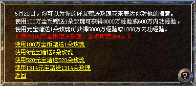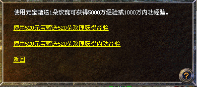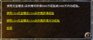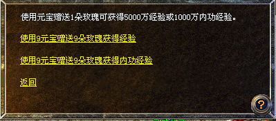 注:使用元宝赠送每朵玫瑰获得5000万经验或1000万内功经验。