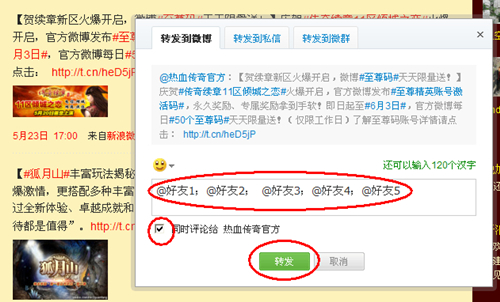 2、在弹出框中,就可以输入您要通知活动信息的互粉好友(@好友微博昵称)。不要忘记勾选输入框左下方“同时评论给热血传官方”。这样我们就能够准确知道您已按照要求转发了活动微博。最后点击“转发”按钮,完成微博转发。
