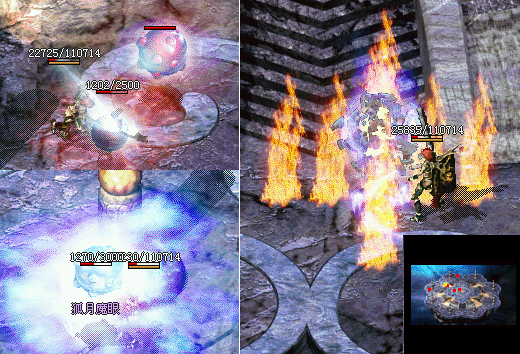 狐月神殿是一个类似莲花座的浮空小岛,色彩很唯美,是我喜欢的梦幻风格,连狐月之眼与狐月魔眼看起来都那么像漂浮的肥皂泡,只是这个泡泡不乖,会主动攻击所有靠近它领地的生命体,甚至在被击破的时候,还会在原地产生一堆火墙……
