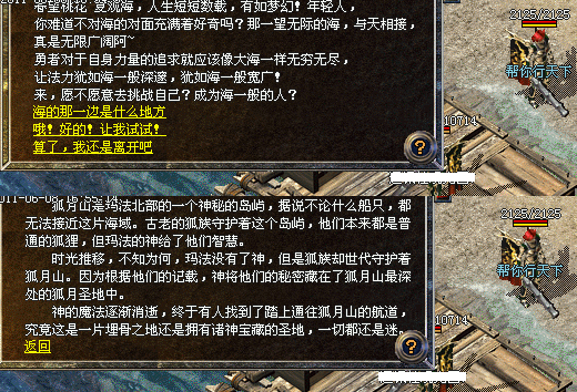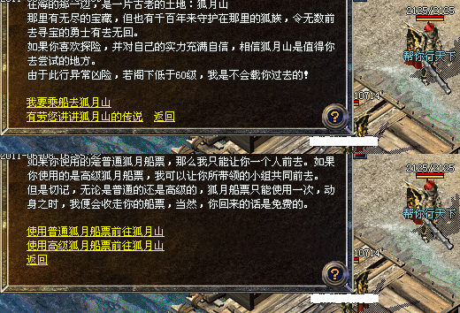 正砍泡泡砍到兴起,忽然咻的一下我飞了,眨眼间回到了盟重安全区,怎么了发生什么事了?一看才知道,原来是自己兴奋过头,按下了回城石的快捷键,脑门上黑线那个囧啊,就这样尴尬的结束了我的第一次狐月山之旅,可惜啊可惜,可惜了那张珍贵的船票。在这里小记也提醒想要去狐月山探险的英雄们,记得把回城石收起来哦,千万别跟小记一样乐极生悲!